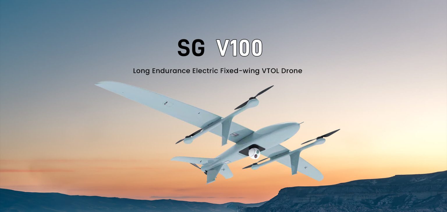 The SG V100 is a fully electric vertical takeoff and landing VTOL fixed wing drone specifically designed for large-scale mission areas. It offers remarkable features such as long endurance, high speed, extended control range, a stable structure, and exceptional reliability.