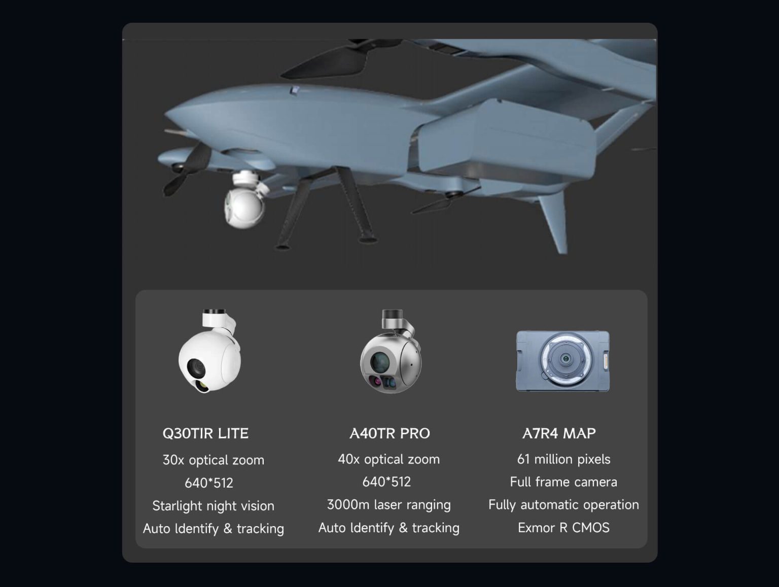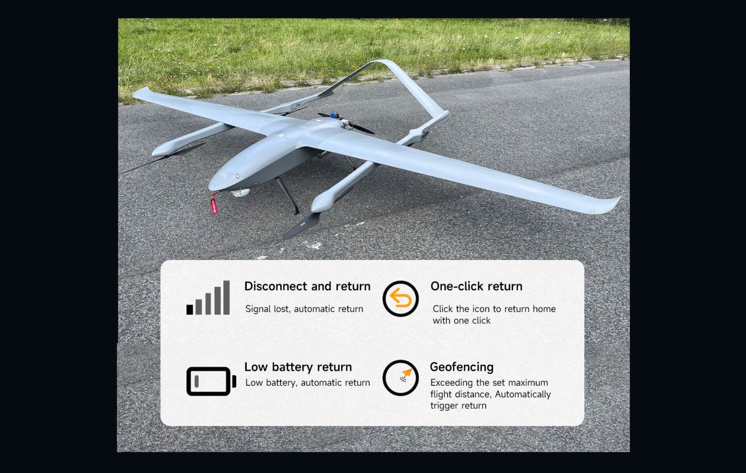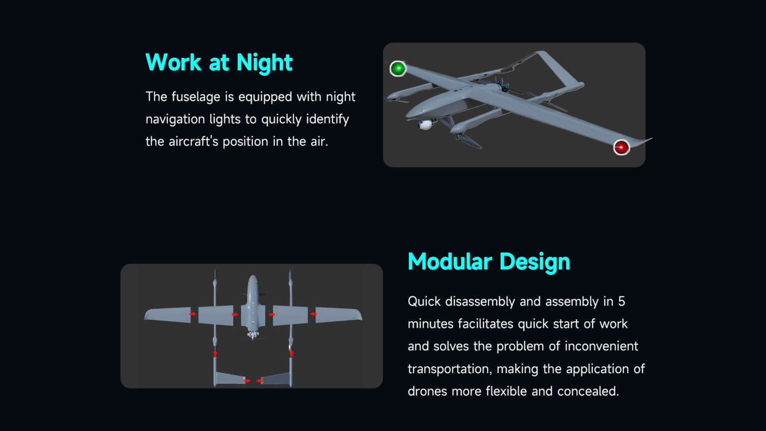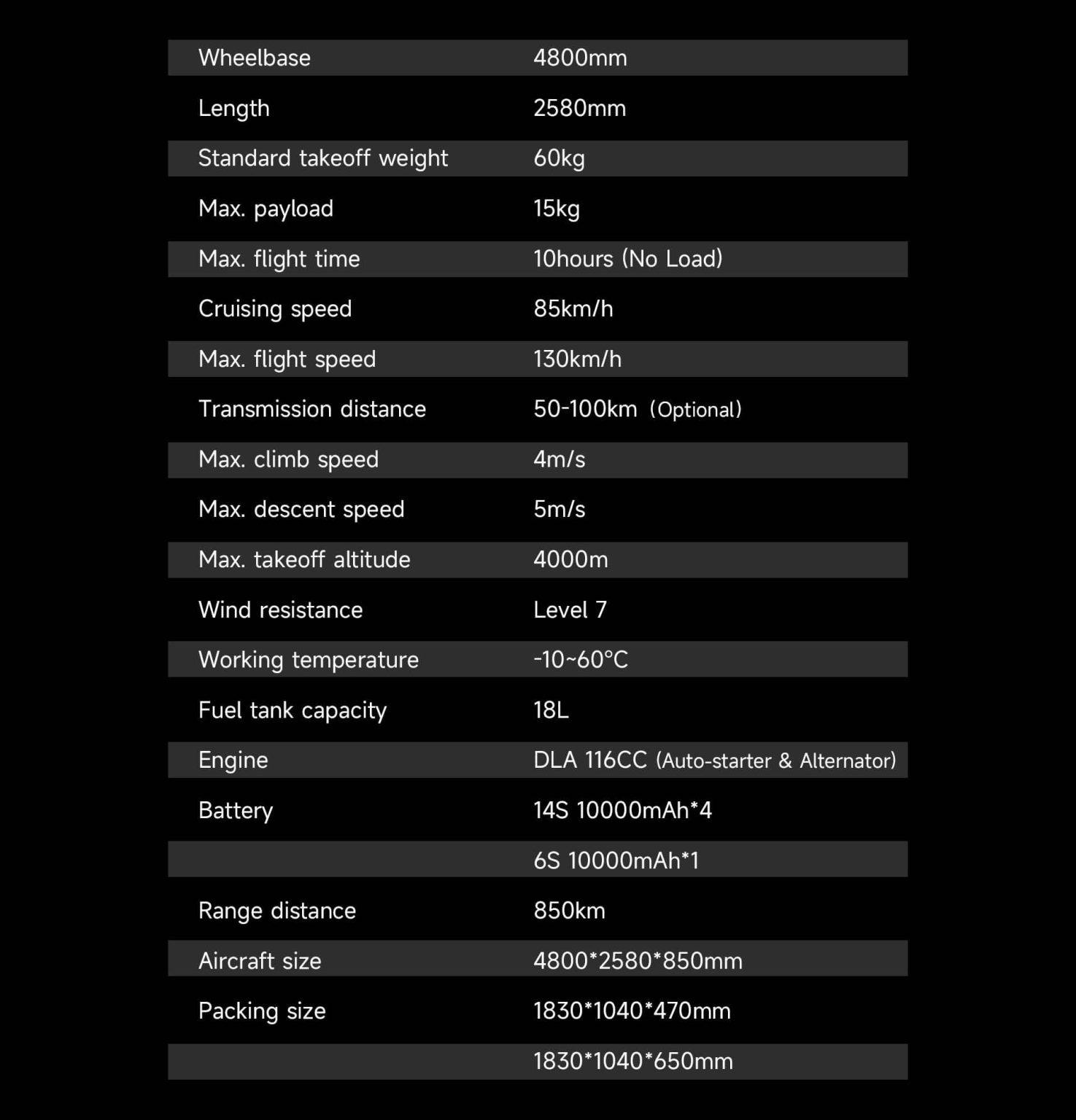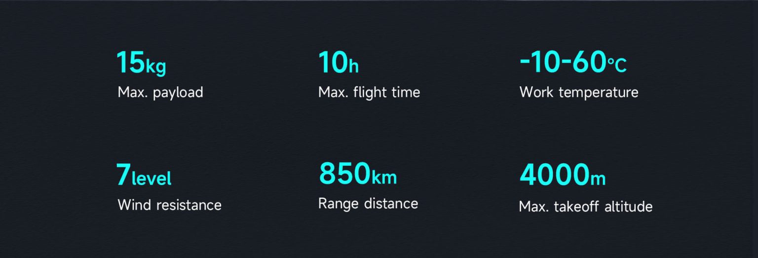 It has a maximum take-off weight of 50 kilograms, a large wing area and a small wingspan, and can carry a maximum payload of 15 kilograms. It is an excellent choice for emergency cargo transportation and fixed-point delivery of missions.