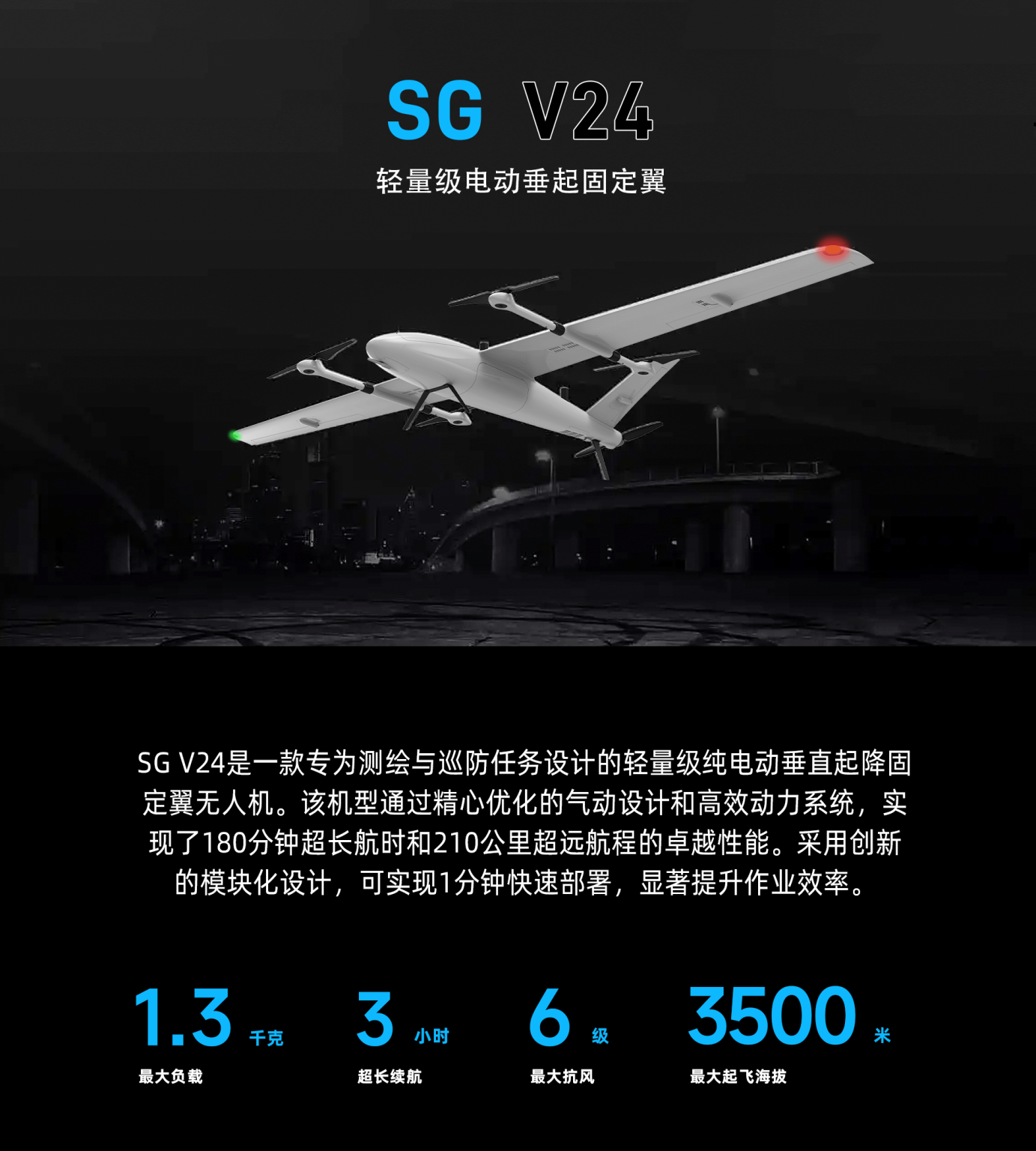 SG V24 采用左红右绿航灯设计,以满足夜间飞行需求,提高安全性和可识别性. 在巡查和追踪应用中,能够高效地完成作业任务。