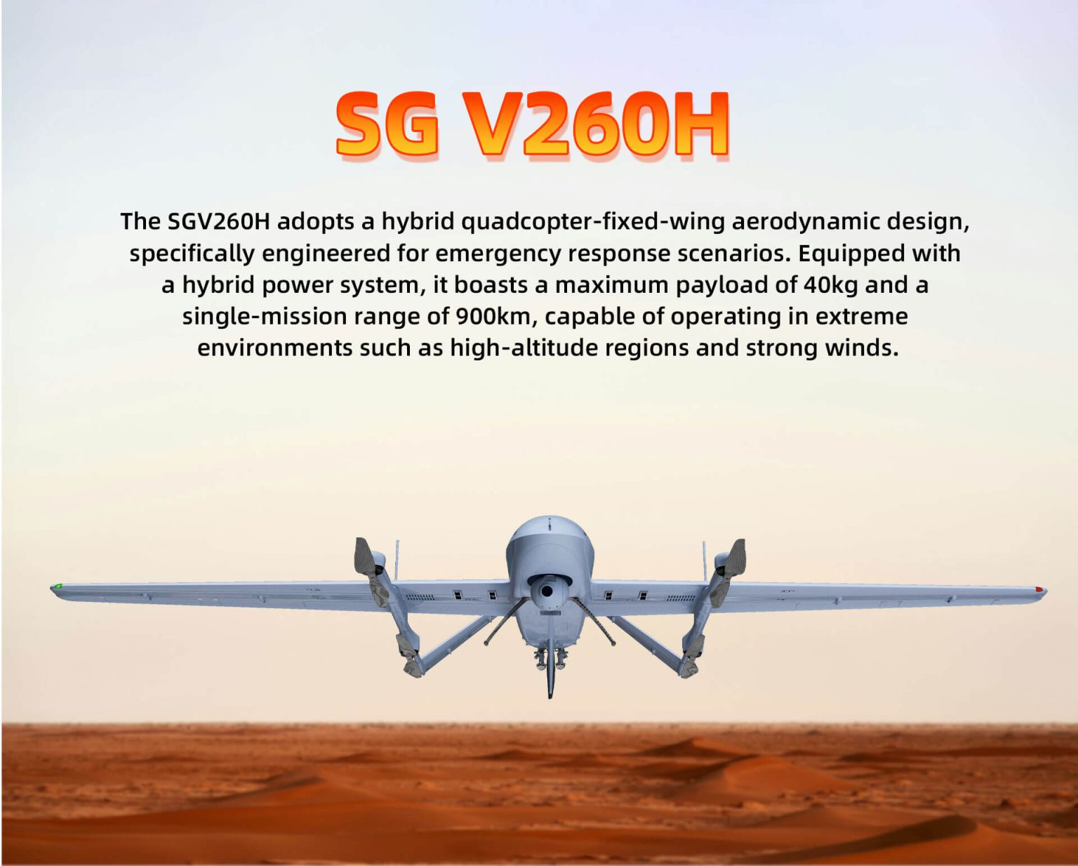 The SG V260H features a hybrid electric-combustion dual-engine system, delivering an endurance of up to 12 hours and a maximum range of 900 km, with a customizable mission radius of 200 km. Rapid Response Capabilities: Climb rate: 4 m/s, Precision descent: 5 m/s, Ensures swift deployment to secure critical mission advantages.