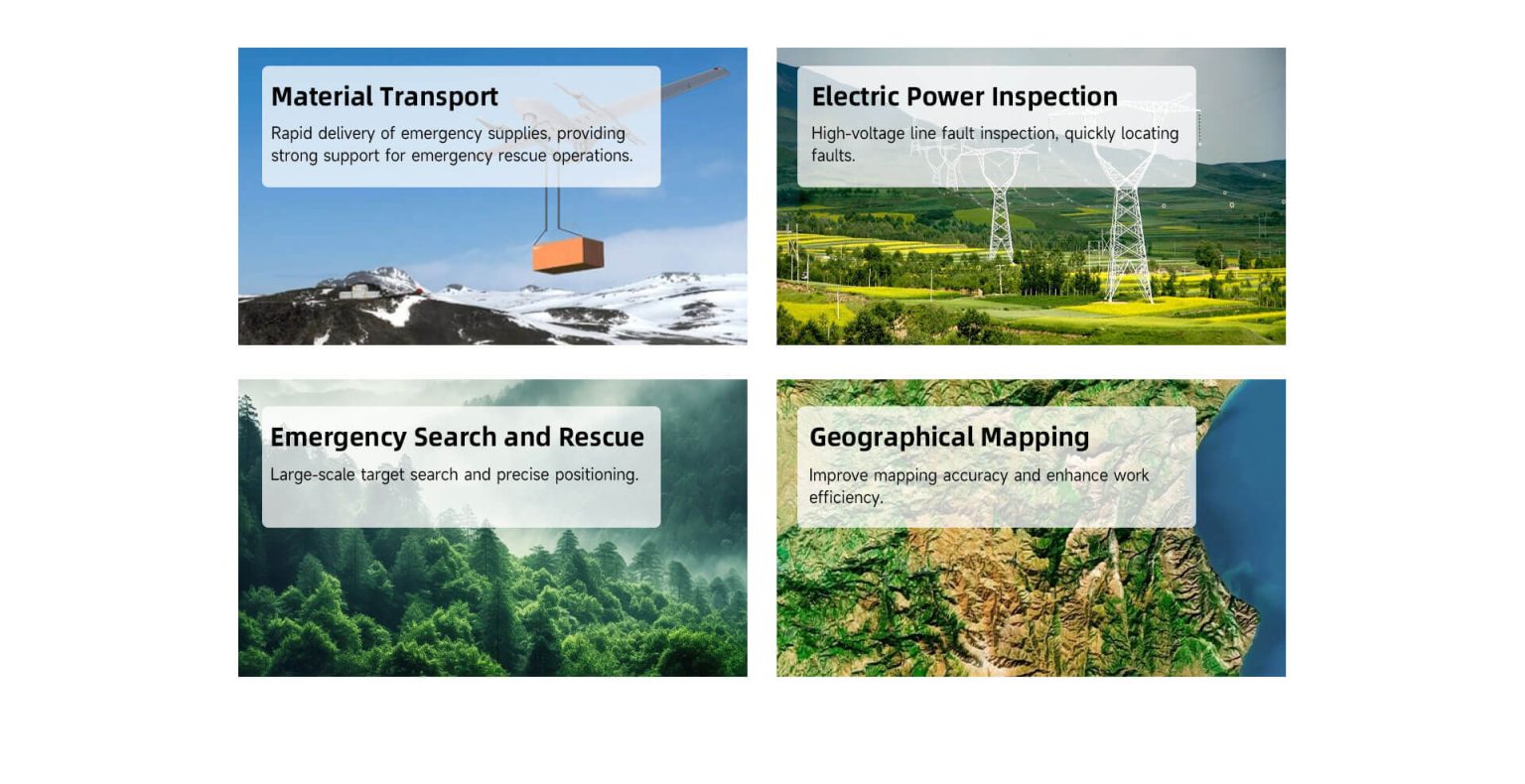 The aircraft features 2×2 mounting points on both wings, capable of carrying firefighting bombs and rescue supplies. The underside of the fuselage can integrate specialized equipment such as electro-optical pods and 3D mapping payloads, enabling instant task mode switching with a single click.